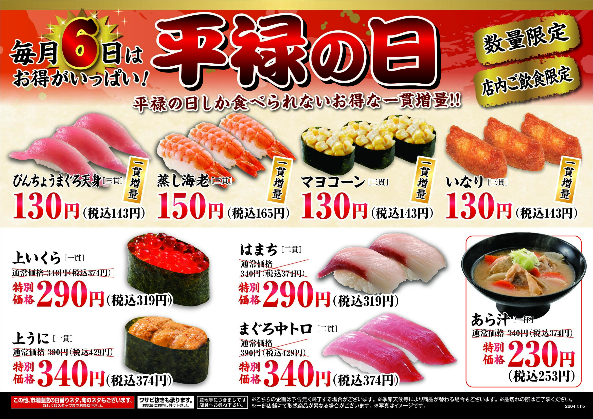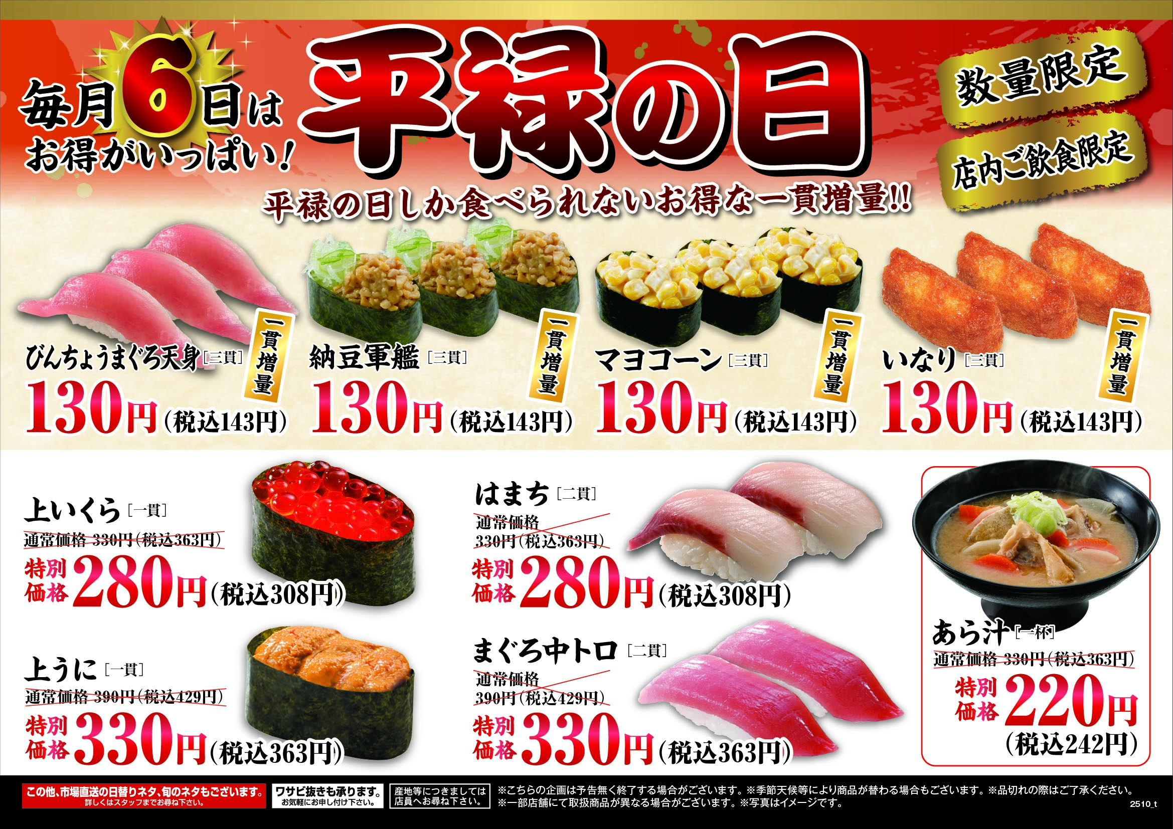 お得な一貫増量商品や極上ネタはいつもよりお安く提供!あら汁はなんと一杯220円(税込242円)で販売いたします。※一部地域、店舗を除く。