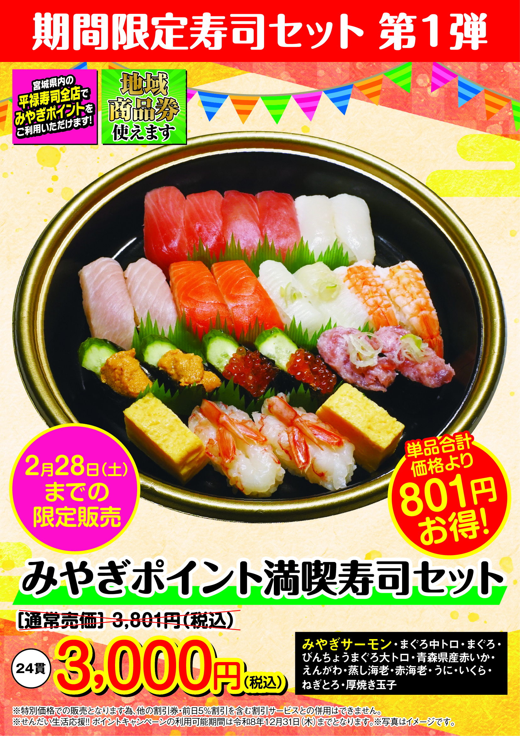 【予告】(宮城県内店舗限定)みやぎポイント満喫寿司セット販売のお知らせ                    開催期間:2026年2月20日(金)~28日(土)まで